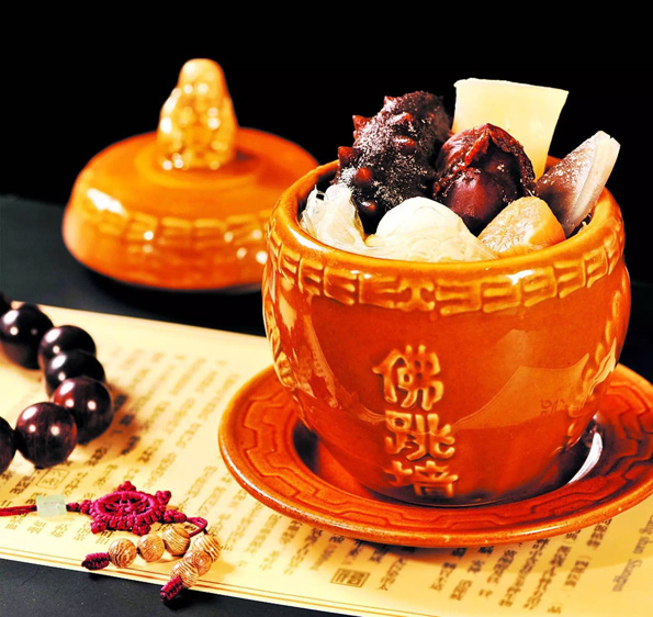 也稱“福壽全”,是用豬肚、雞鴨、羊肉、鴿蛋以及海產品等10多種材料,一起裝進紹興酒壇,然后煨制而成。一開酒壇,滿室幽香,個中滋味,回味無窮。